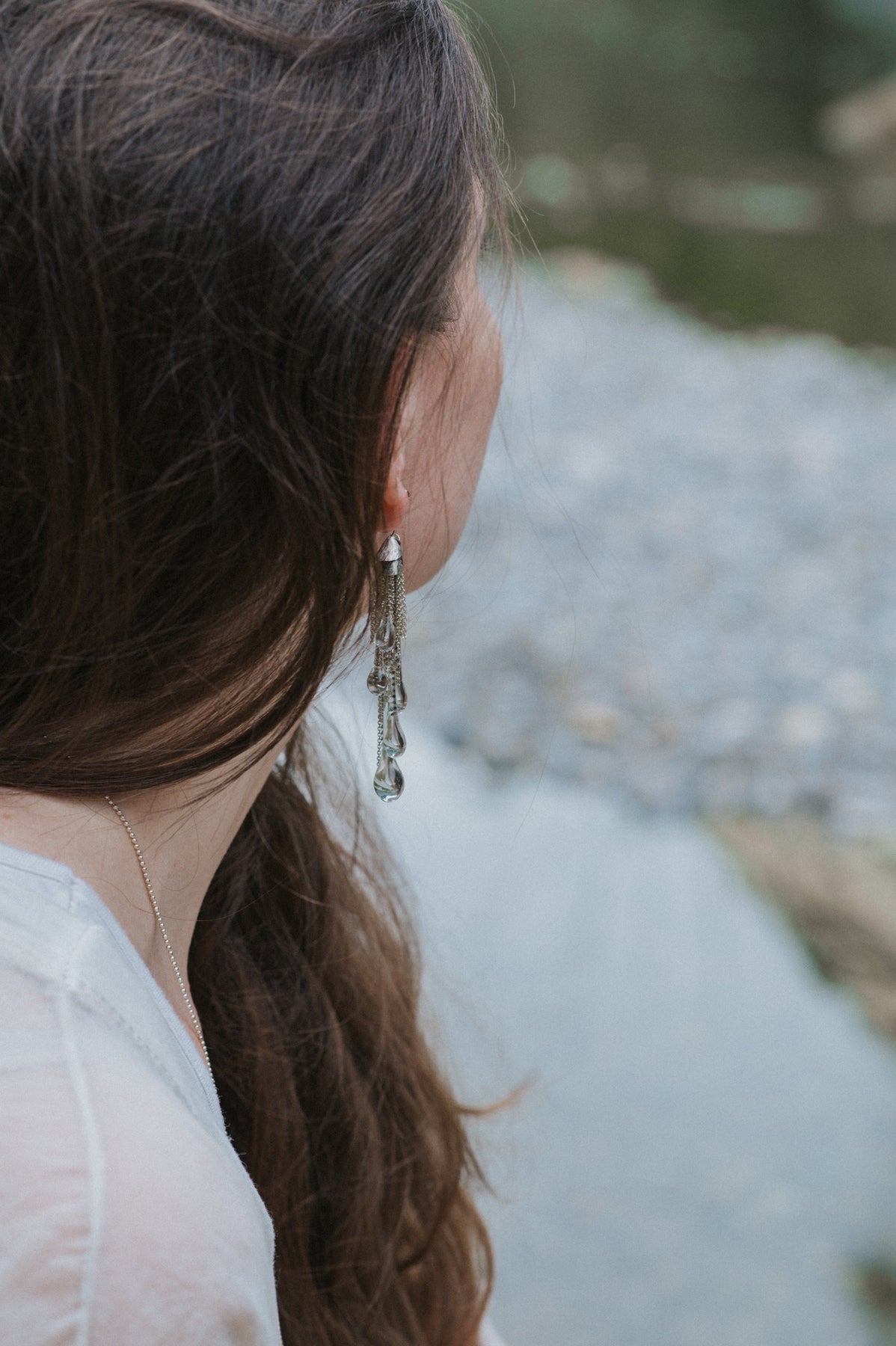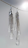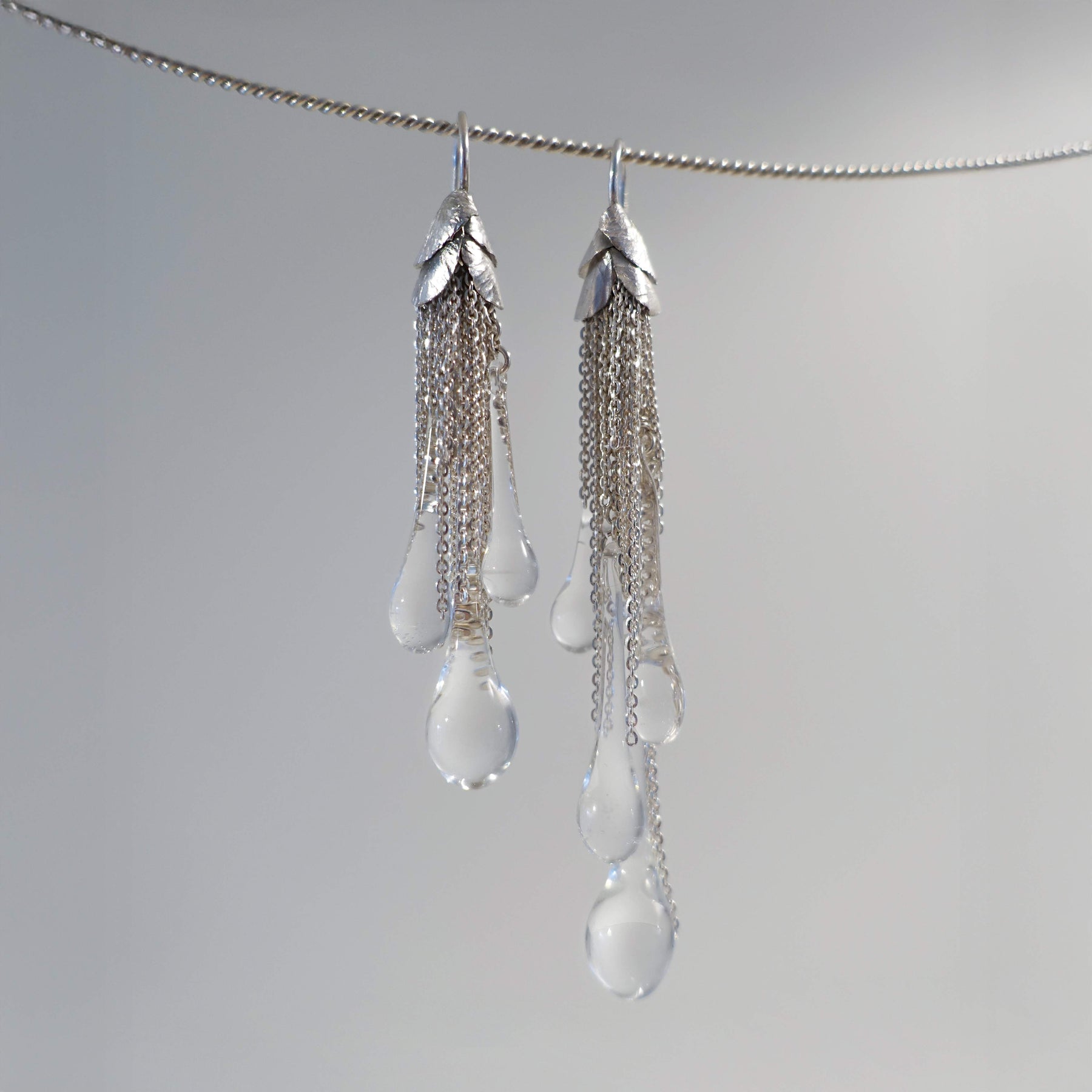 Handgefertigte asymmetrische Ohrhänger aus Silber 925 mit 9 feinen Glastropfen, hergestellt von der Glaskünstlerin Priska King-Tobler.