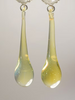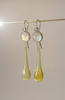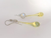 Handgefertigte Ohrhänger aus Silber 925 mit zwei Glastropfen, hergestellt von der Glaskünstlerin Priska King-Tobler und je einem weissen Labradorit Cabochon (auch Regenbogenmondstein genannt) und einem kleinen Aquamarin.